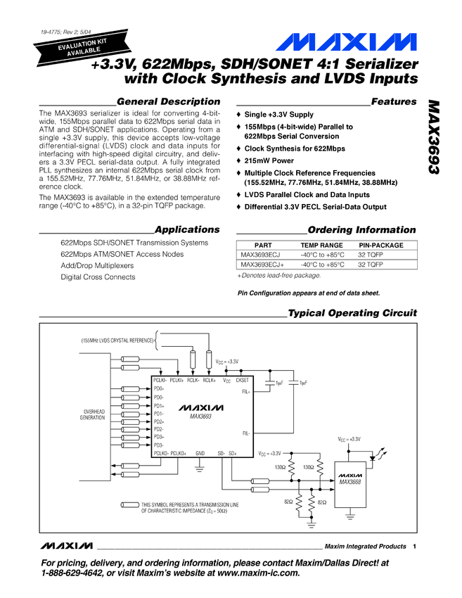 MAX3693 +3.3V, 622Mbps SDH/SONET 4:1 Serializer with Clock Synthesis and LVDS Inputs