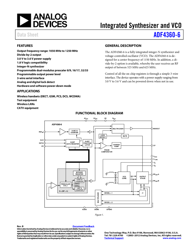 ADF4360-6: Integrated Integer-N Synthesizer and VCO - Output Frequency 1050 to 1250
