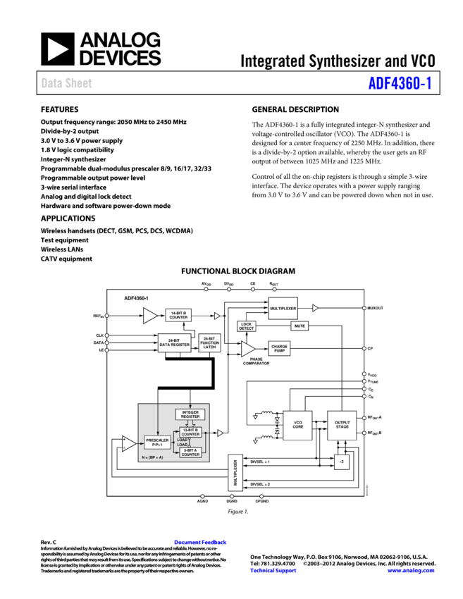 ADF4360-1: Integrated Integer-N Synthesizer and VCO - Output Frequency 2050 to 2450