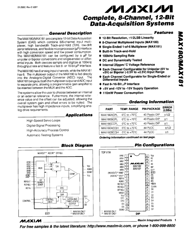 MAX180, MAX181 Complete, 100ksps, 8-Channel, 12-Bit Data Acquisition Systems