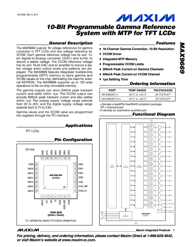 MAX9669 10-Bit Programmable Gamma Reference System with MTP for TFT LCDs