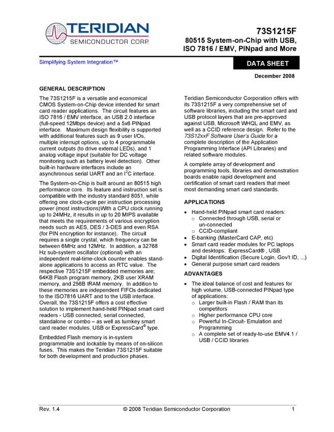 73S1215F 80515 System-on-Chip with USB, ISO 7816/EMV, PINpad, and More