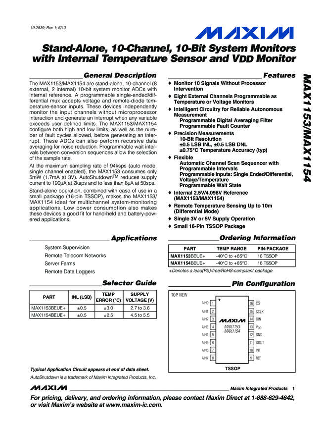 MAX1153, MAX1154 Stand-Alone, 10-Channel, 10-Bit System Monitors with Internal Temperature Sensor and VDD Monitor