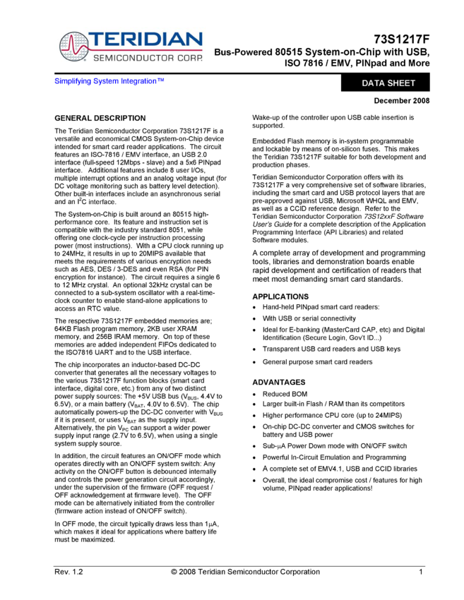 73S1217F Bus-Powered 80515 System-on-Chip with USB, ISO 7816/EMV, PINpad, and More