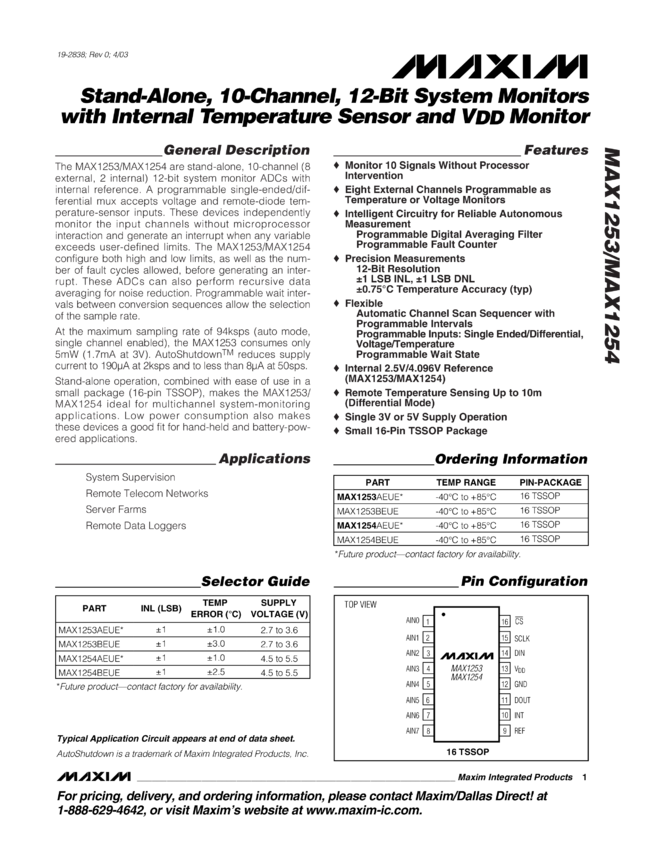 MAX1253, MAX1254 Stand-Alone, 10-Channel, 12-Bit System Monitors with Internal Temperature Sensor and VDD Monitor