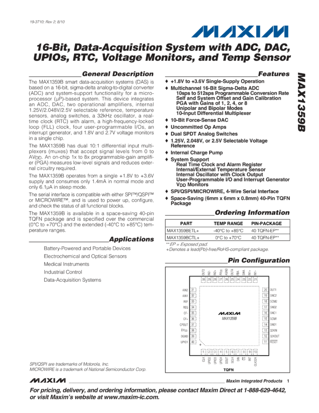 MAX1359B 16-Bit, Data-Acquisition System with ADC, DAC, UPIOs, RTC, Voltage Monitors, and Temp Sensor