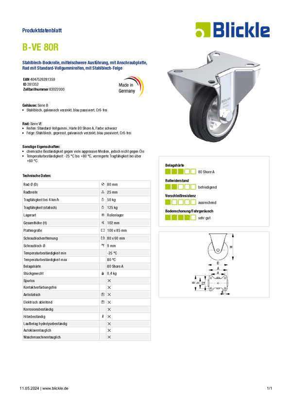 Kółko z systemem blokowania Blickle B-VE 80R, średnica: 80 mm