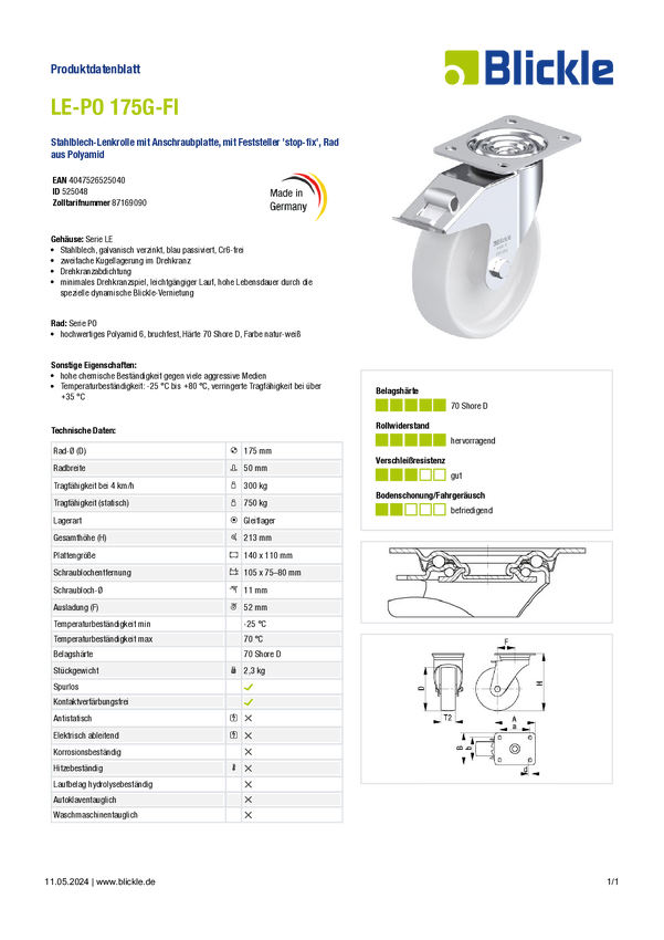 Kółko z systemem blokowania Blickle LE-PO 175G-FI, średnica: 175 mm, obrotowe