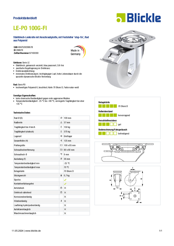Kółko z systemem blokowania Blickle LE-PO 100G-FI, średnica: 100 mm, obrotowe