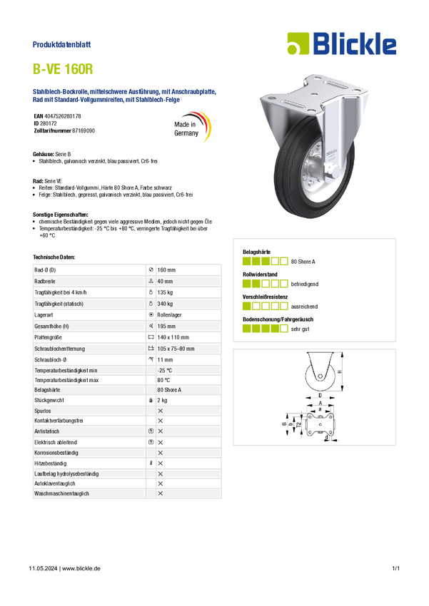 Kółko z systemem blokowania Blickle B-VE 160R, średnica: 160 mm