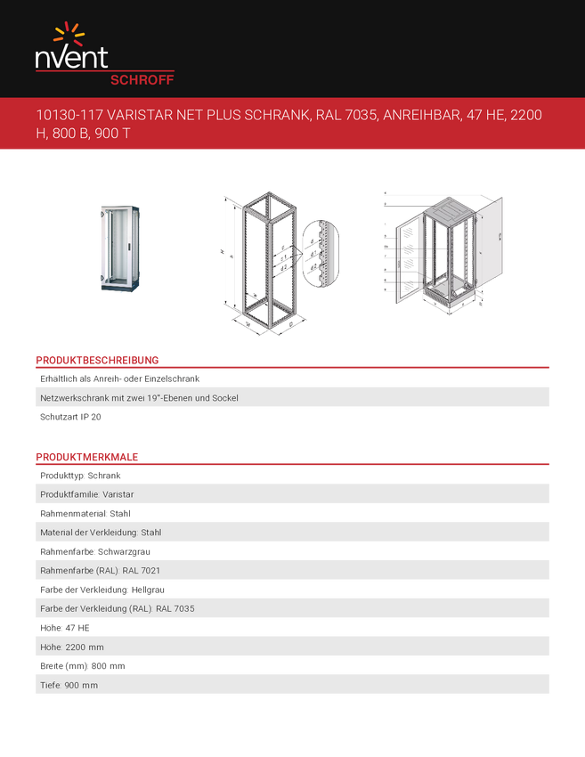 nVent SCHROFF 10130116 Obudowa pusta szafy sieciowej/serwerowej 800 x 2200 x 900 szaro-biały (ral 7035) 1 szt.