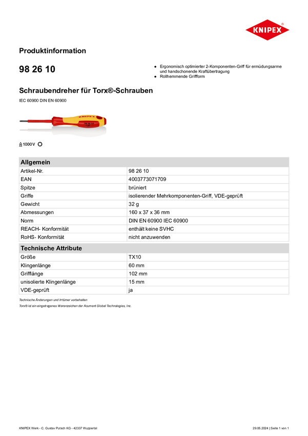 Wkrętak sześciokątny T 10 Knipex Knipex-Werk 98 26 10