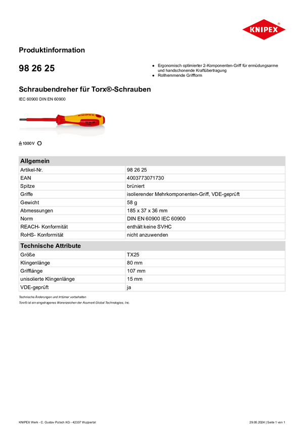 Knipex Knipex-Werk VDE Wkrętak sześciokątny Rozmiar wkrętaka T 25 Długość końcówki: 80 mm DIN EN 60900 1 szt.