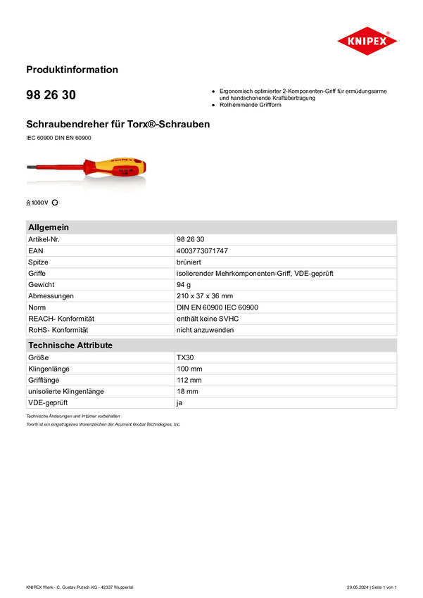 Knipex Knipex-Werk VDE Wkrętak sześciokątny Rozmiar wkrętaka T 30 Długość końcówki: 100 mm DIN EN 60900