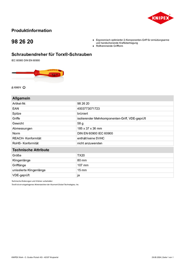Knipex Knipex-Werk VDE Wkrętak sześciokątny Rozmiar wkrętaka T 20 Długość końcówki: 80 mm DIN EN 60900