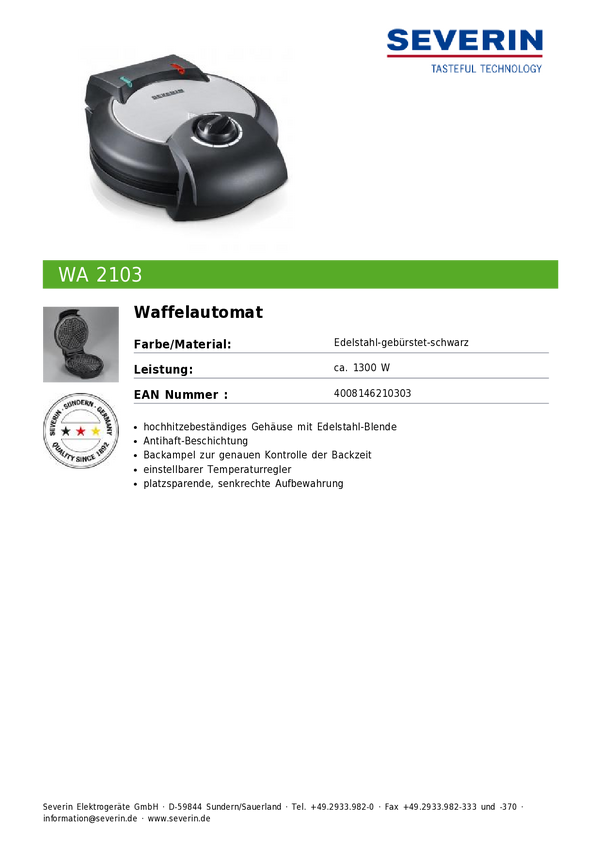 Gofrownica Severin WA 2103, 1200 W, kolor: stal szlachetna ( szczotkowana ) , Czarny