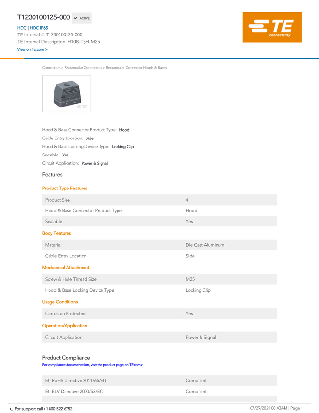 TE Connectivity T1230160125-000 HEAVY DUTY RECT SIBAS TE Connectivity T1230160125-000, 8 szt.