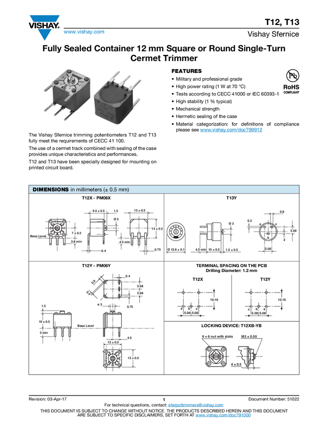 Fully Sealed Container 12 mm Square or Round Single-Turn Cermet Trimmer