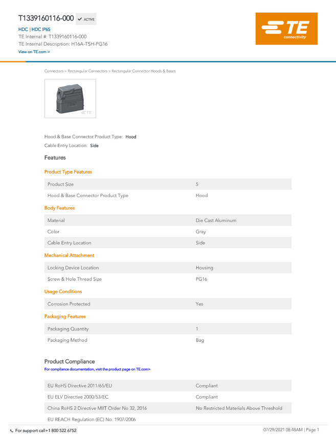 TE Connectivity T1330060116-000 HEAVY DUTY RECT SIBAS TE Connectivity T1330060116-000, 1 szt.