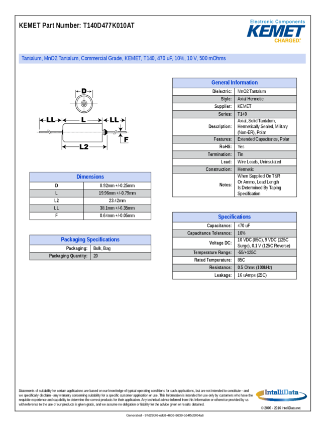 Cap Tant Solid 470uF 10V 10% (8.92 X 19.96mm) Axial 0.5 Ohm 125°C Bulk