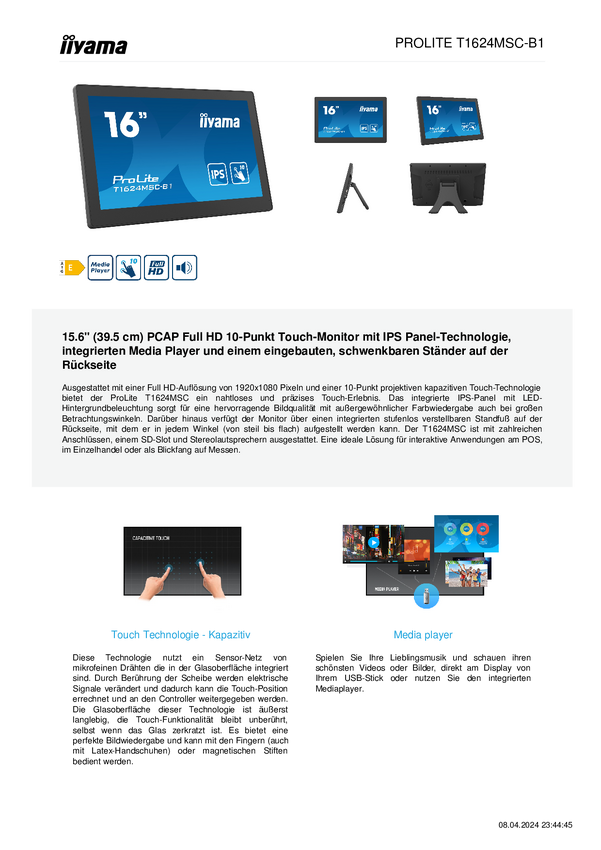 T1624MSC-B1 / 15,6" PCAP 10P, dotykowy, 1920