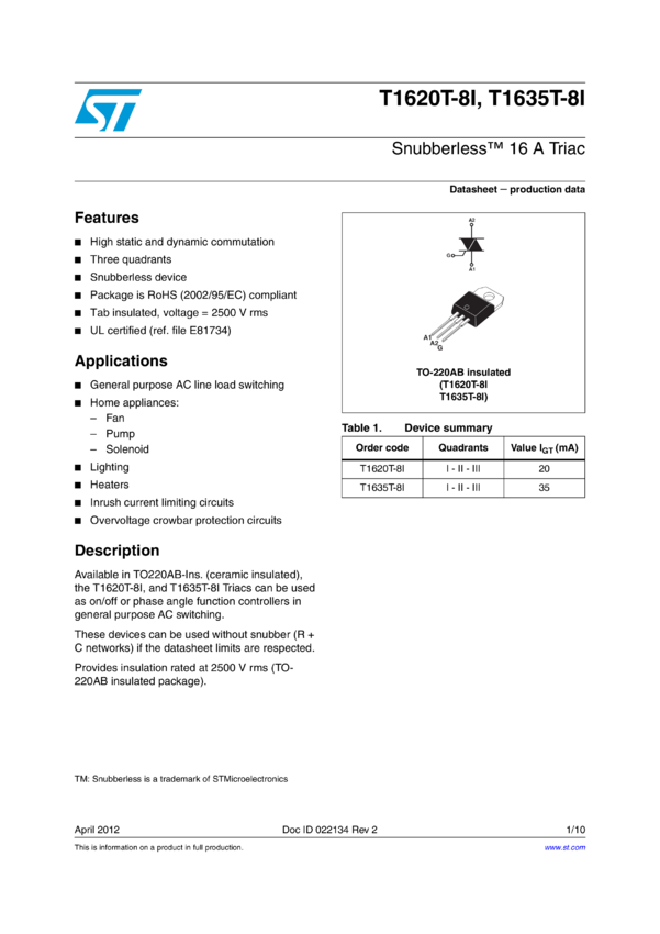 TRIAC STMicroelectronics T1635-600G, 1 szt.