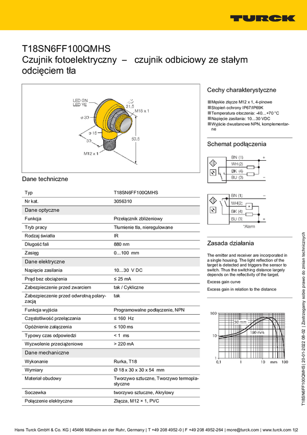 Czujnik dyfuzyjny Turck T18SN6FF100QMHS 3056310 1 szt.
