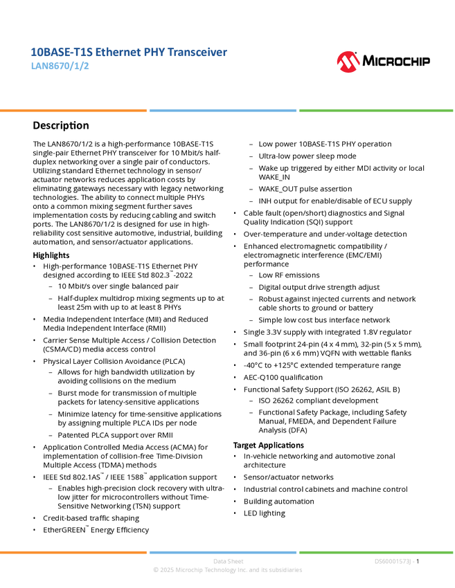 LAN8670/1/2 10BASE-T1S Ethernet PHY Transceiver Datasheet
