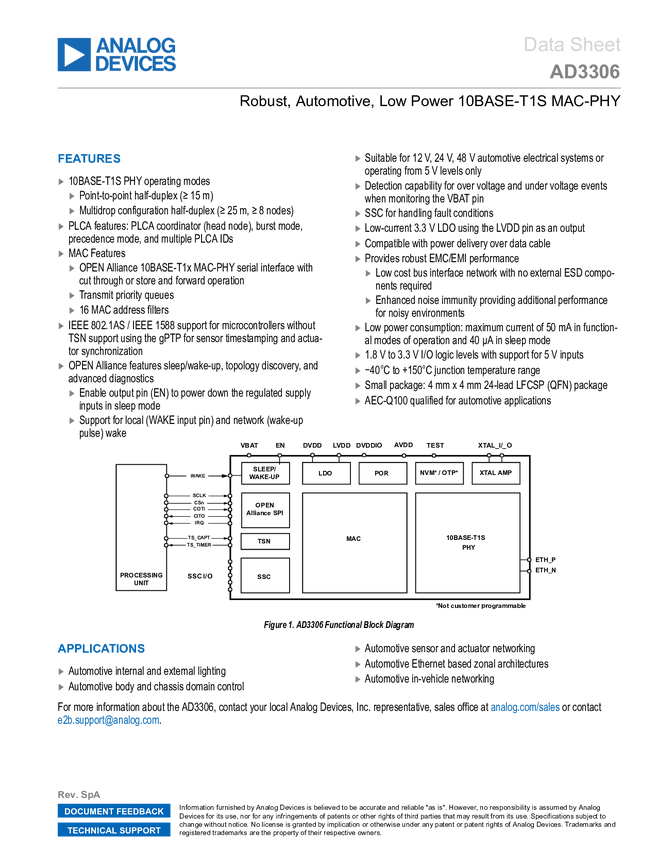 Ethernet Controller, 10 Mb/s, Single-Pair, MAC + PHY, 802.3cg, 10BASE−T1S Compliant