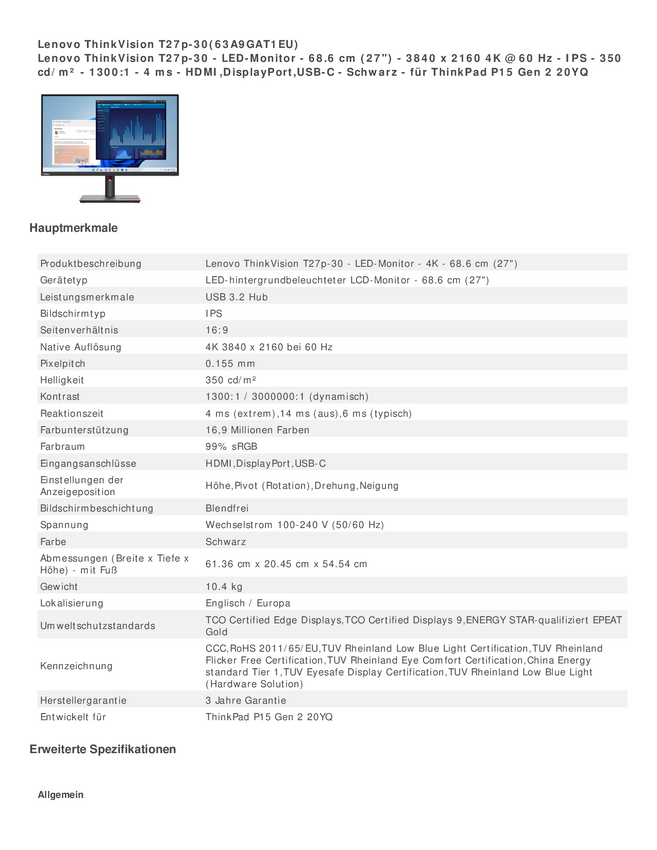 Lenovo ThinkVision T27i-30 Monitor EEK F (A - G) 68.6 cm (27 cal) 1920 x 1080 px 16:9 4 ms DisplayPort, HDMI, Audio-Line