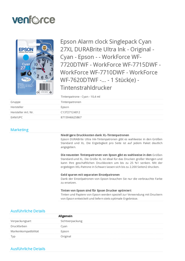Tusz Epson T2712, 27XL, cyjan C13T27124012