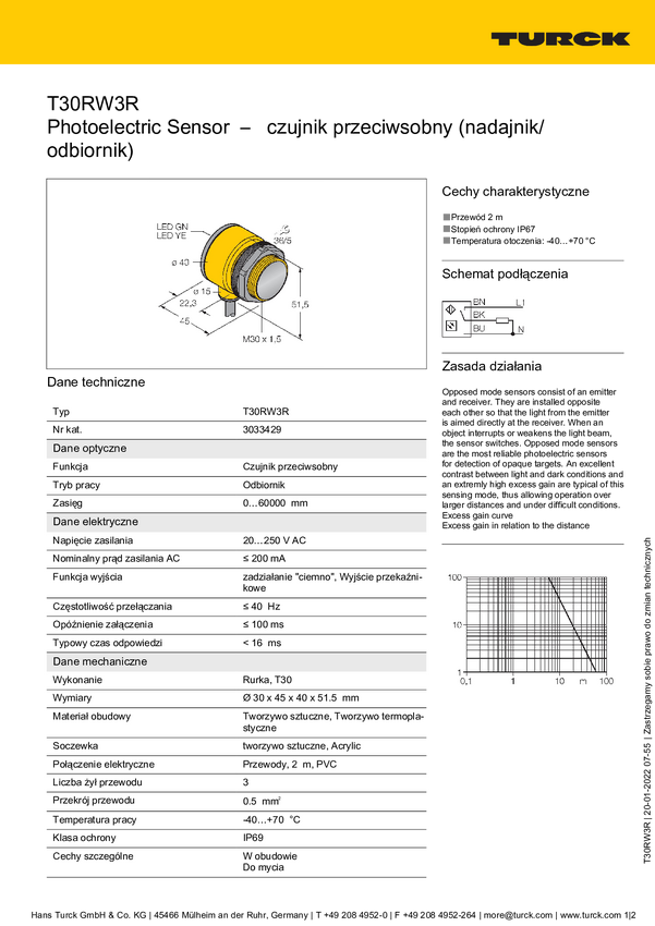 Bezzwrotny czujnik fotoelektryczny Turck T30RW3RE 3037073 przełączanie w ciemności 1 szt.