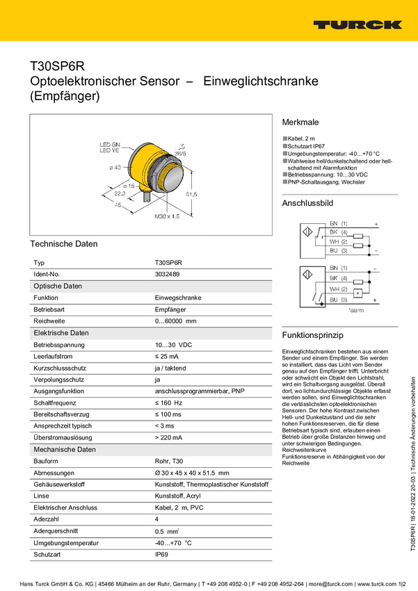 Bezzwrotny czujnik fotoelektryczny Turck T30SP6R 3032489 1 szt.