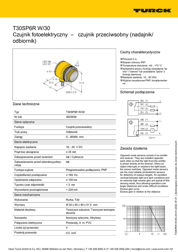 Bezzwrotny czujnik fotoelektryczny Turck T30SP6R W/30 3033939 1 szt.