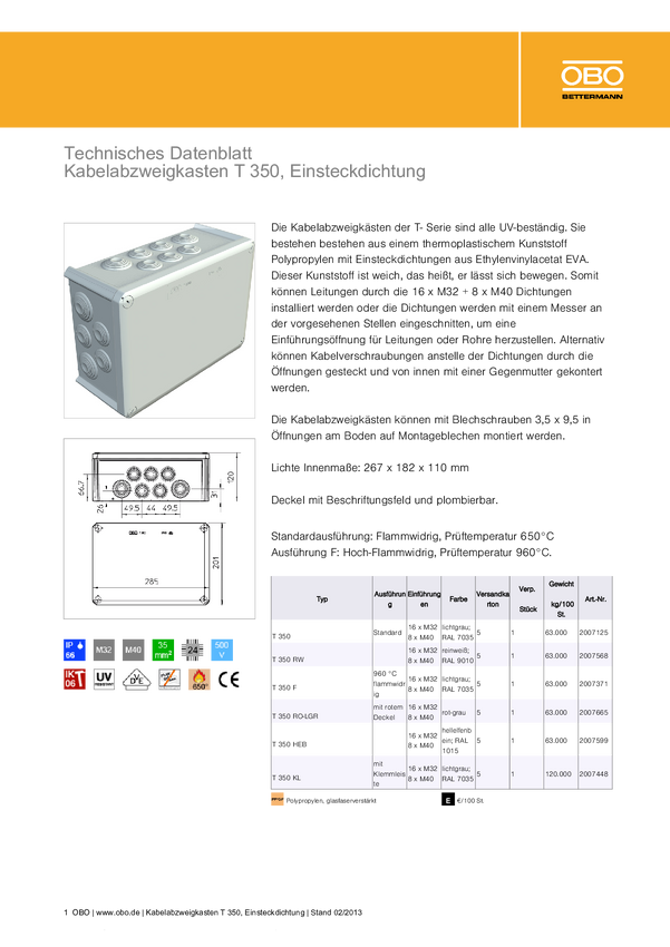 Skrzynka przyłączeniowa OBO Bettermann T350, IP66, (D x S x W) 285 x 201 x 120 mm, szaro-biały (ral 7035), 1 szt.