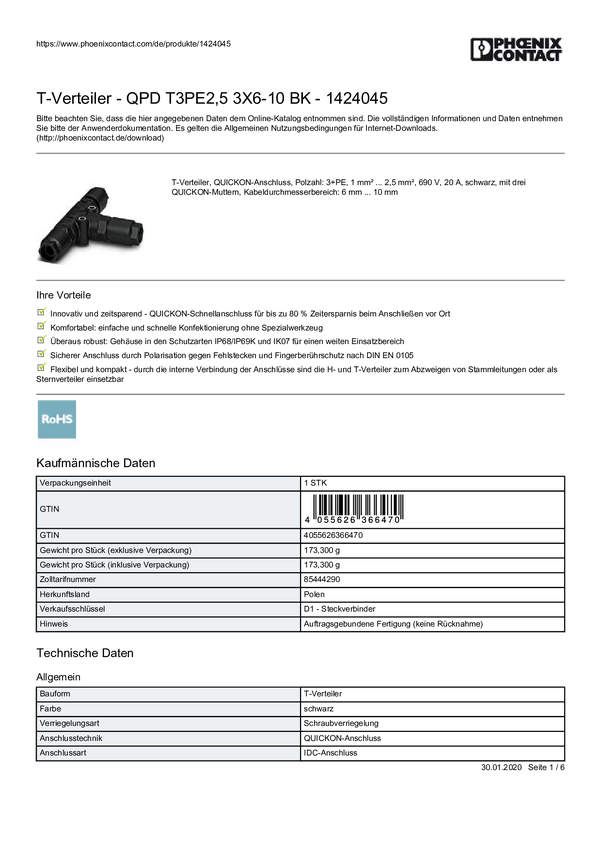 Phoenix Contact 1424045 Rozdzielacz T QPD T3PE2,5 3X6-10 BK, 1 szt.