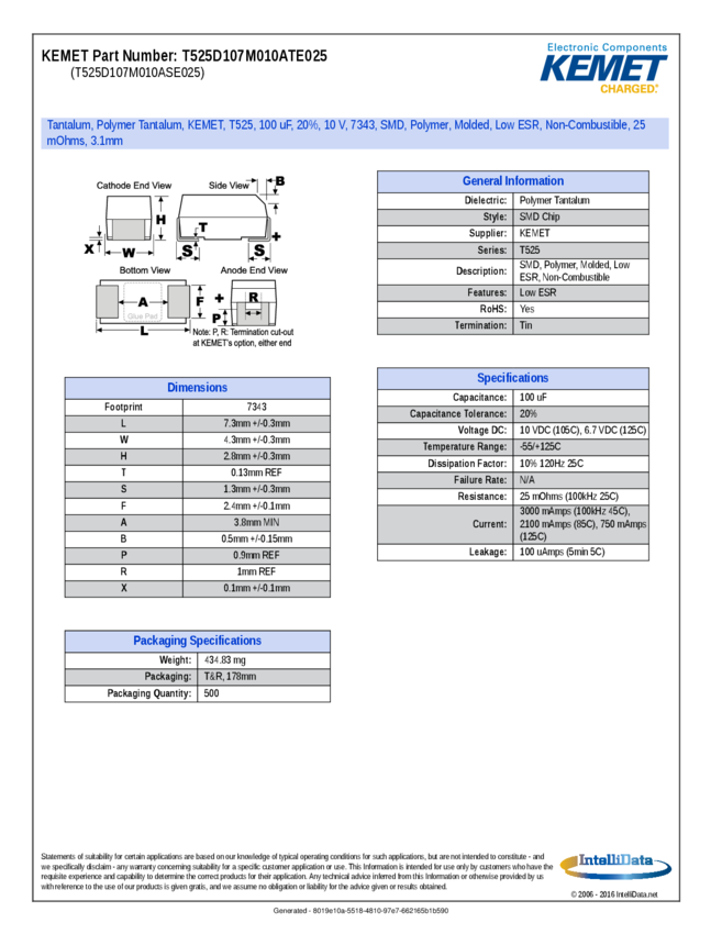 Cap Tant Solid 100uF 10V D CASE 20% (7.3 X 4.3 X 2.8mm) SMD 7343-31 0.025 Ohm 125°C T/R