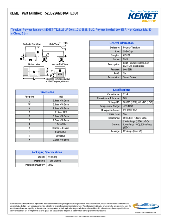 Cap Tant Solid 22uF 10V B CASE 20% (3.5 X 2.8 X 1.9mm) SMD 3528-21 0.08 Ohm 125°C T/R