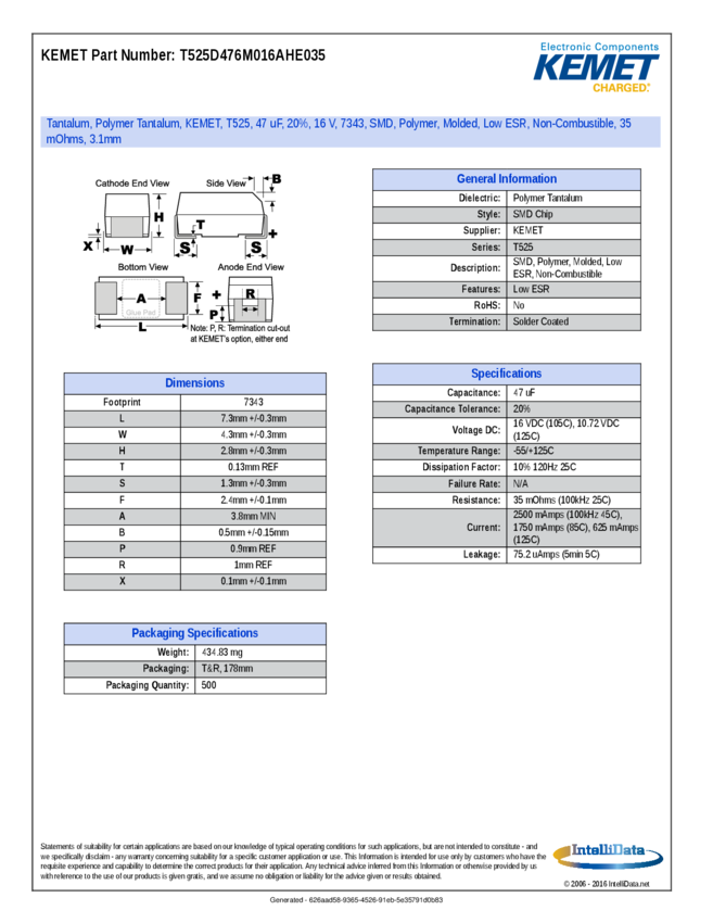 Cap Tant Solid 47uF 16V D CASE 20% (7.3 X 4.3 X 2.8mm) SMD 7343-31 0.035 Ohm 125°C T/R