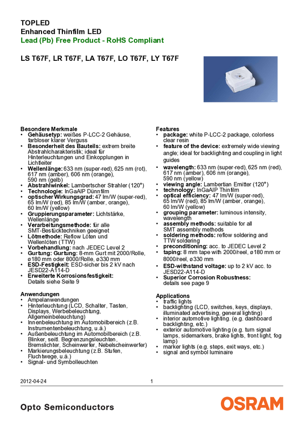 Dioda LED SMD OSRAM LR T67F-U1AA-1-1-Z 925 mcd 120 ° 20 mA 2.05 V 1 szt.