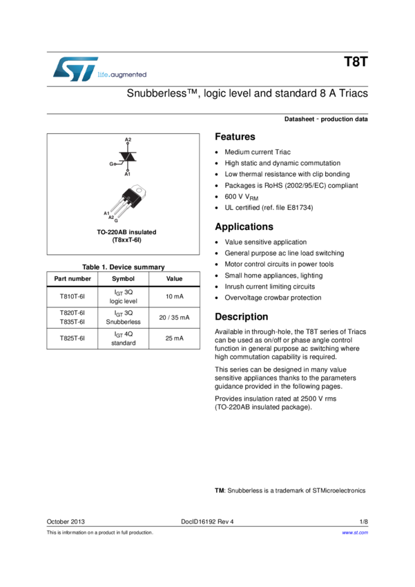 Thyristor TRIAC 600V 84A 3-Pin(2+Tab) D2PAK T/R