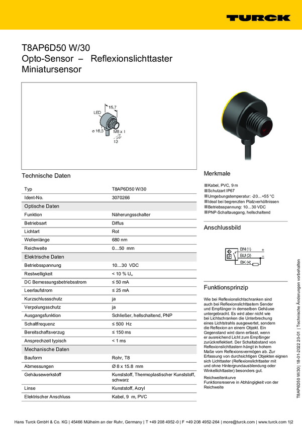 Czujnik dyfuzyjny Turck T8AP6D50 W/30 3070266 przełączanie światła 1 szt.