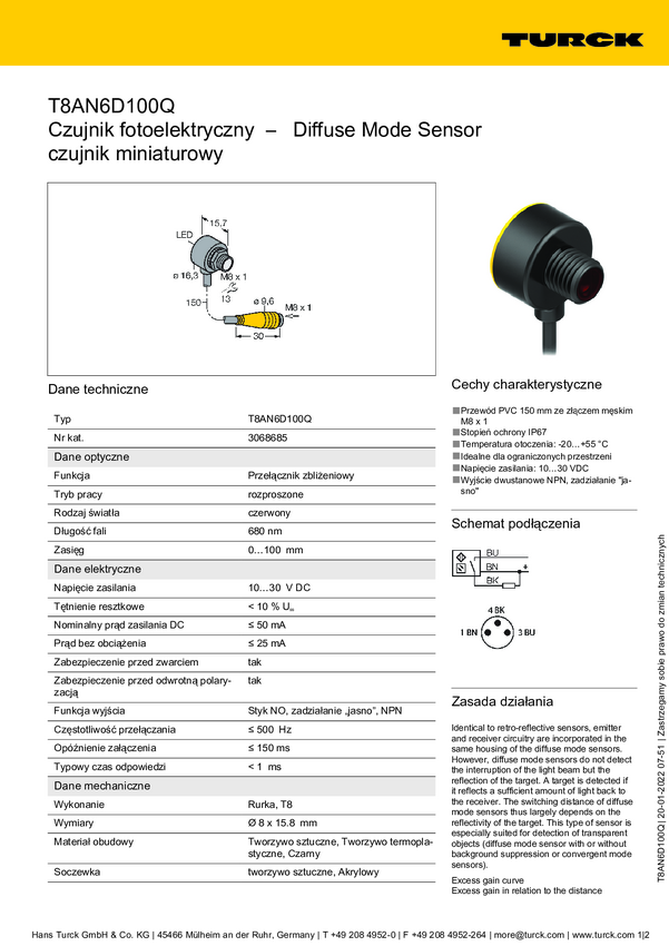 Czujnik dyfuzyjny Turck T8AN6D100 3068684 przełączanie światła 1 szt.