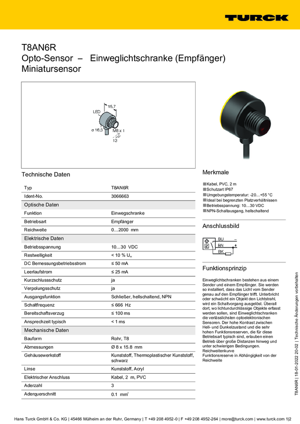 Bezzwrotny czujnik fotoelektryczny Turck T8AN6R 3066663 przełączanie światła 1 szt.