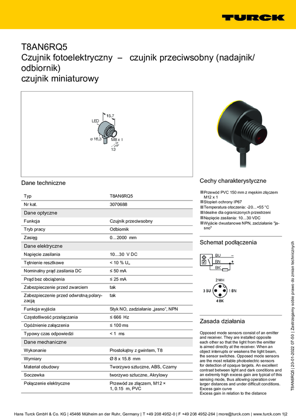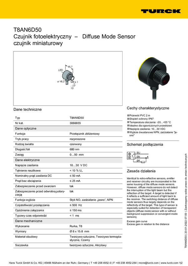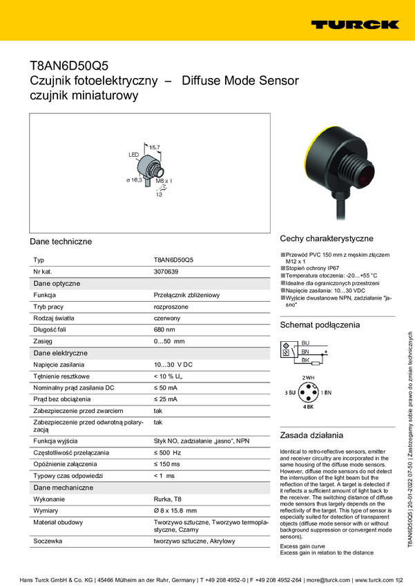 Czujnik dyfuzyjny Turck T8AN6D50 3066655 przełączanie światła 1 szt.
