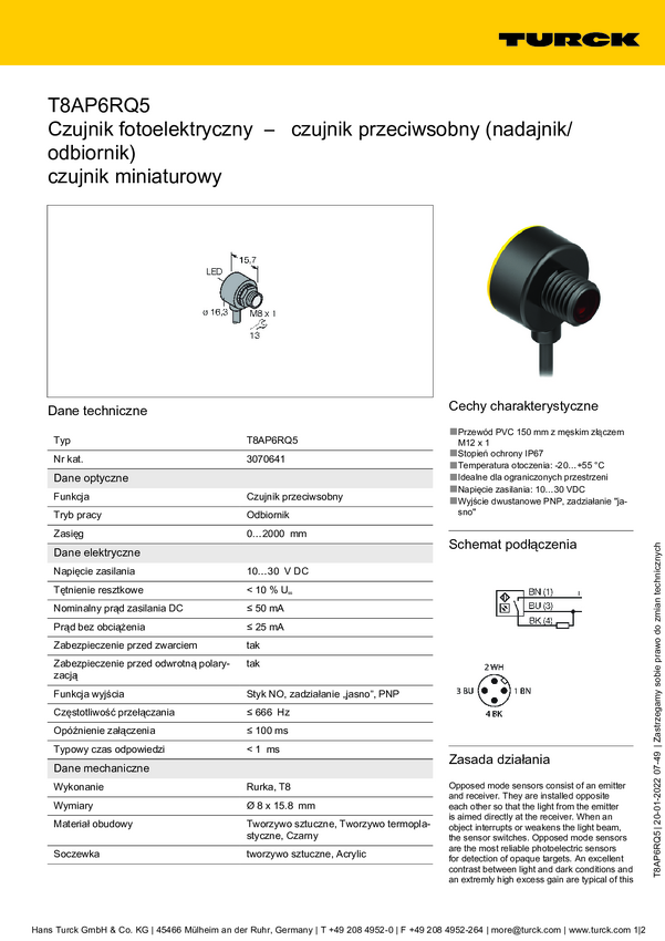 Bezzwrotny czujnik fotoelektryczny Turck T8AP6RQ5 3070641 1 szt.