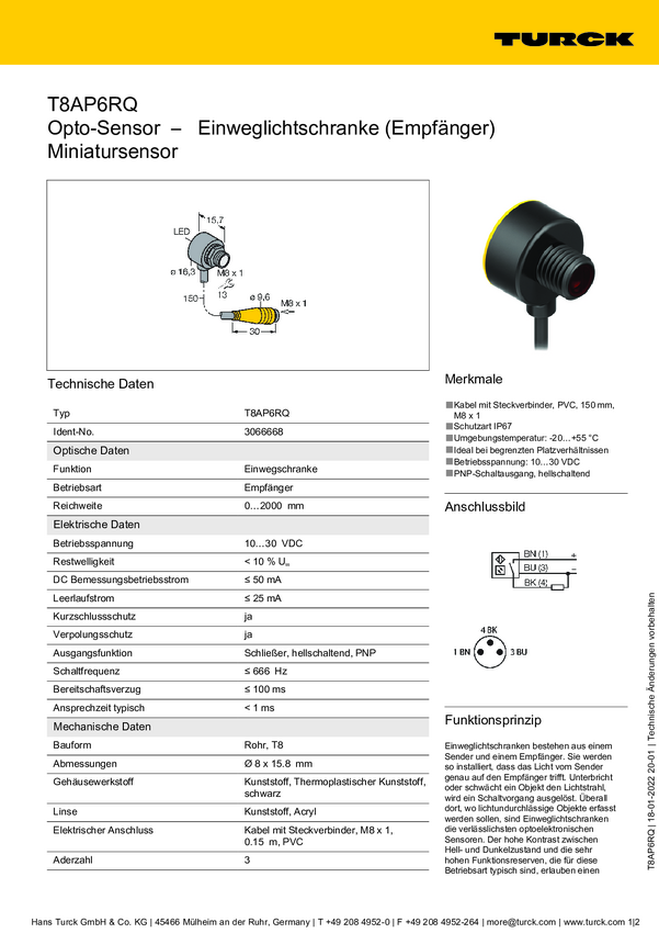 Bezzwrotny czujnik fotoelektryczny Turck T8AP6RQ 3066668 1 szt.
