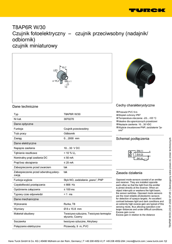 Bezzwrotny czujnik fotoelektryczny Turck T8AP6R W/30 3070270 przełączanie światła 1 szt.