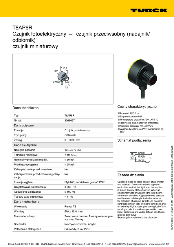 Bezzwrotny czujnik fotoelektryczny Turck T8AP6R 3066667 1 szt.