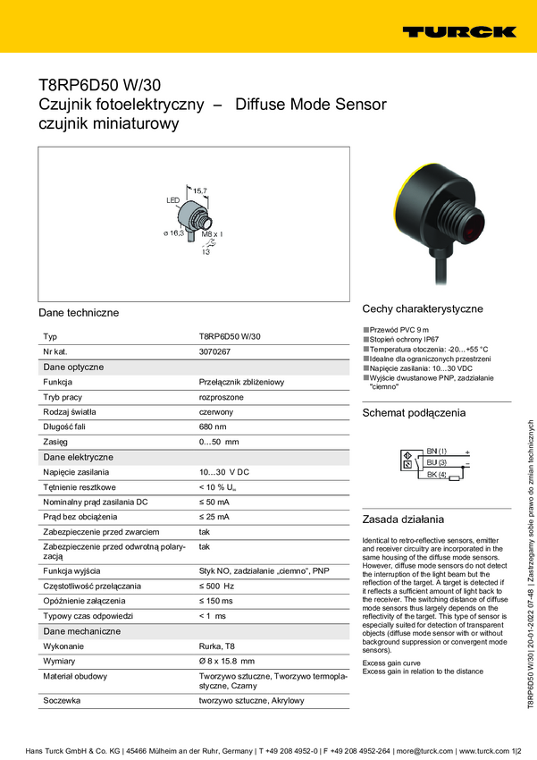 Czujnik dyfuzyjny Turck T8RP6D50 W/30 3070267 przełączanie w ciemności 1 szt.